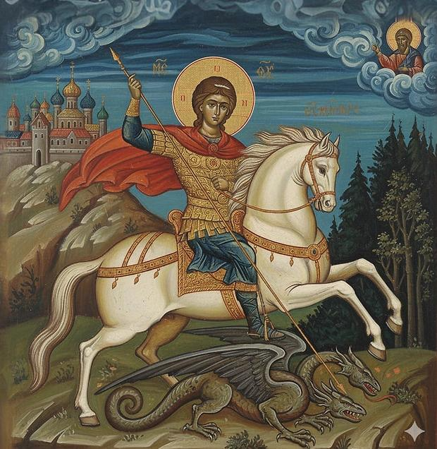 Вмч. Георгий Победоносец, римский военачальник III-IV веков, родился в Палестине. При императоре Диоклетиане он открыто исповедал свою веру во Христа, раздал имущество бедным и обличил жестокость гонителей. После пыток был обезглавлен в Никомидии в 303 году. Прославился посмертным чудом – явлением на белом коне и поражением змия, опустошавшего землю близ Бейрута, что обратило многих местных жителей в христианство. Мощи святого хранятся в городе Лидде.
