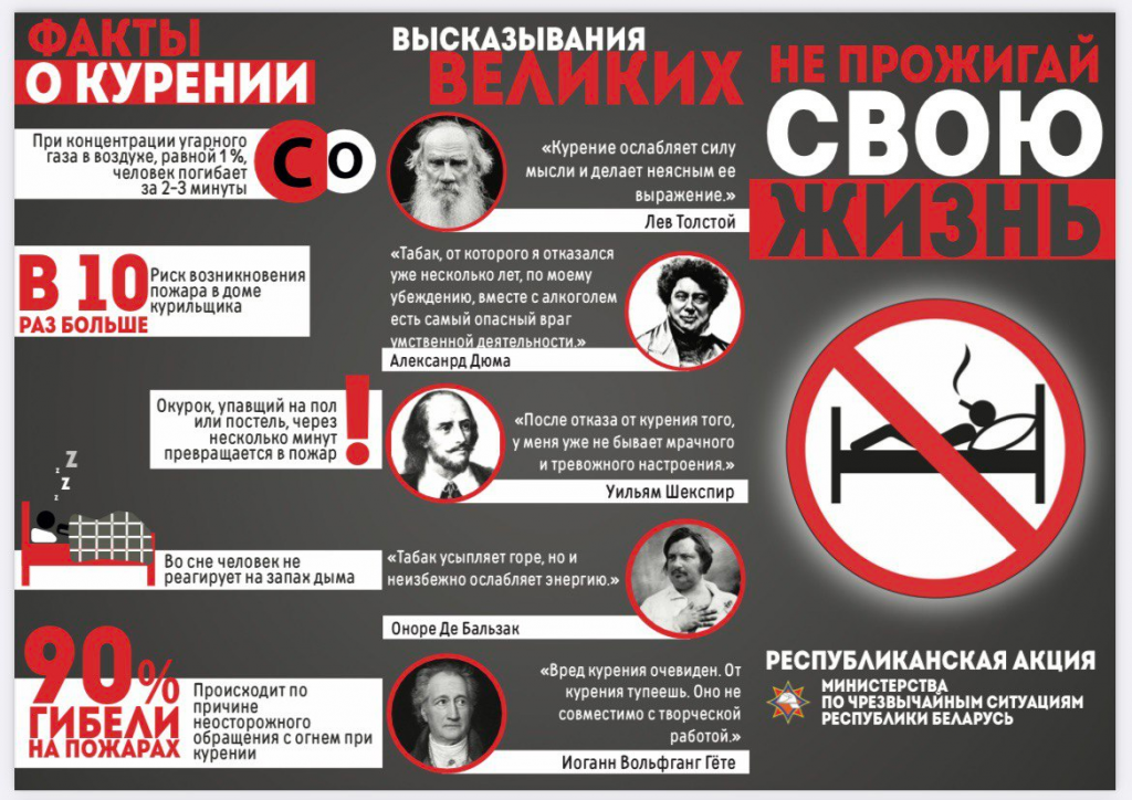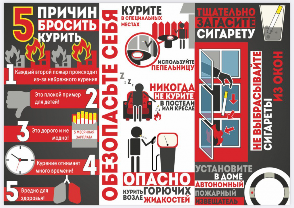 Не курите в постели, тем более в состоянии алкогольного опьянения. Помните, если вовремя не потушить сигарету, от нее может загореться одежда или мебель. Даже потушенные сигареты нельзя выбрасывать в урны с бумагами и другими горючими отходами, а также из окон или балконов. Для этих целей подойдет емкость из негорючего материала, лучше всего наполненная водой. Уходя из дома, закрывайте окна, чтобы брошенный кем-то горящий окурок не залетел к вам. Не складируйте на балконах легковоспламеняющиеся и горючие материалы.