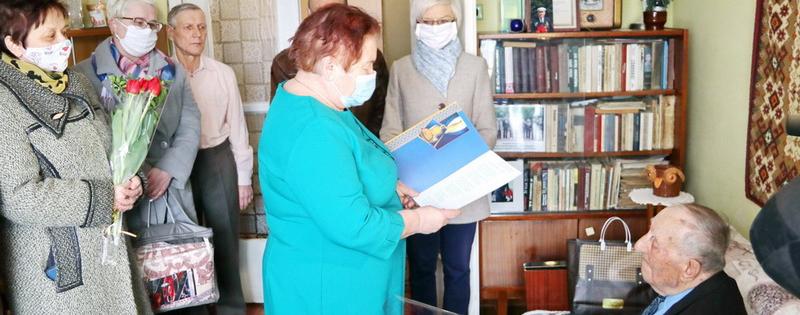 Со знаменательной датой с подарками и поздравлениями долгожителя поздравили председатель районного Совета депутатов Сергей Мишарин, заместитель председателя Новогрудского райисполкома Светлана Королько, военный комисар Новогрудского и Кореличского районов Сергей Бурак, председатель районного Совета ветеранов Анна Лопата, председатель районного отделения Белорусского общества инвалидов Людмила Масаева, представители организации ОАО «Белкредо», где трудился юбиляр.