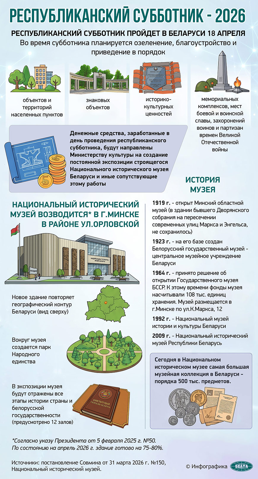 Денежные средства, заработанные от проведения весеннего субботника, будут направлены на создание постоянной экспозиции строящегося Национального исторического музея Беларуси и иные сопутствующие этому работы.
