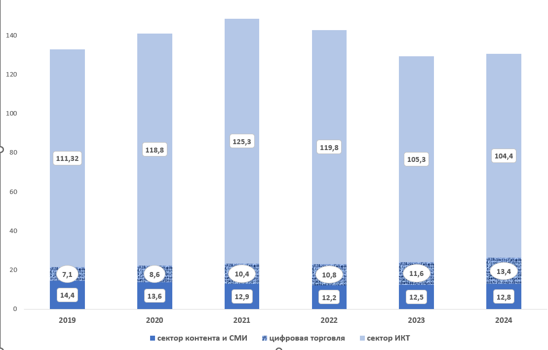 В частности, сектор ИКТ обеспечивает 6,2% ВВП и 5,4% валовой добавленной стоимости, сектор контента и СМИ – 0,3% (как и в 2023 году). В тоже время доля цифровой торговли в ВВП за год выросла с 0,3 до 0,4%, а в валовой добавленной стоимости – с 0,3 до 0,4%.